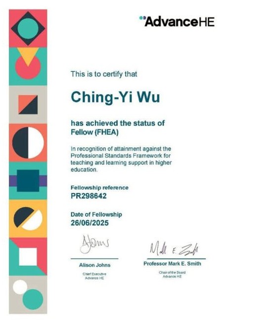 Associate Professor Ching-Yi Wu has been awarded the internationally recognized Fellowship of the UK Higher Education Academy (HEA), highlighting her teaching excellence and professional standards aligned with global higher education benchmarks.